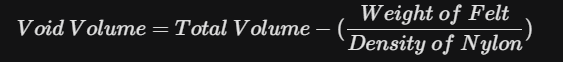This is the internal space within the felt available to hold water while it is in the nip (the point of compression). It is calculated by subtracting the volume of the synthetic fibers from the total volume of the felt.