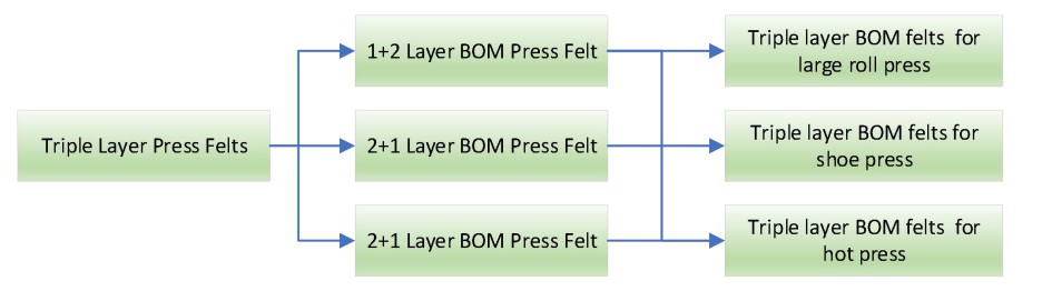 Three-layer BOM papermaking press felts include 1+2 composite, 2+1 composite and 1+1+1 composite three-layer BOM papermaking felts.