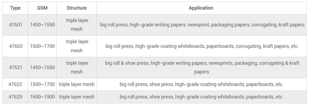 The triple layer felt is suitable for vacuum compound press of medium and high-speed paper machine, large wheel through blind hole press, shoe press and other types of press. It is used for making all kinds of high-grade newsprint and cultural paper, hanging panel paper, jammed paper and other paper types.