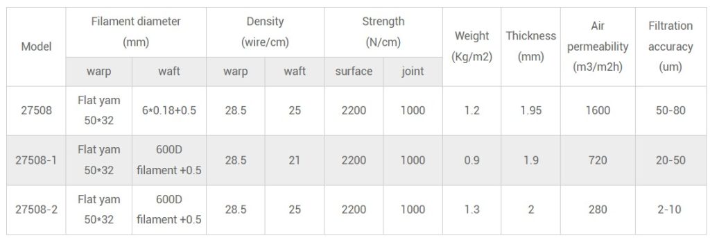 ● Vacuum filter belt made from mixed polyester mono-filaments and multifilament performs excellently in areas of flue gas desulfurization and filtration such as sludge dewatering.